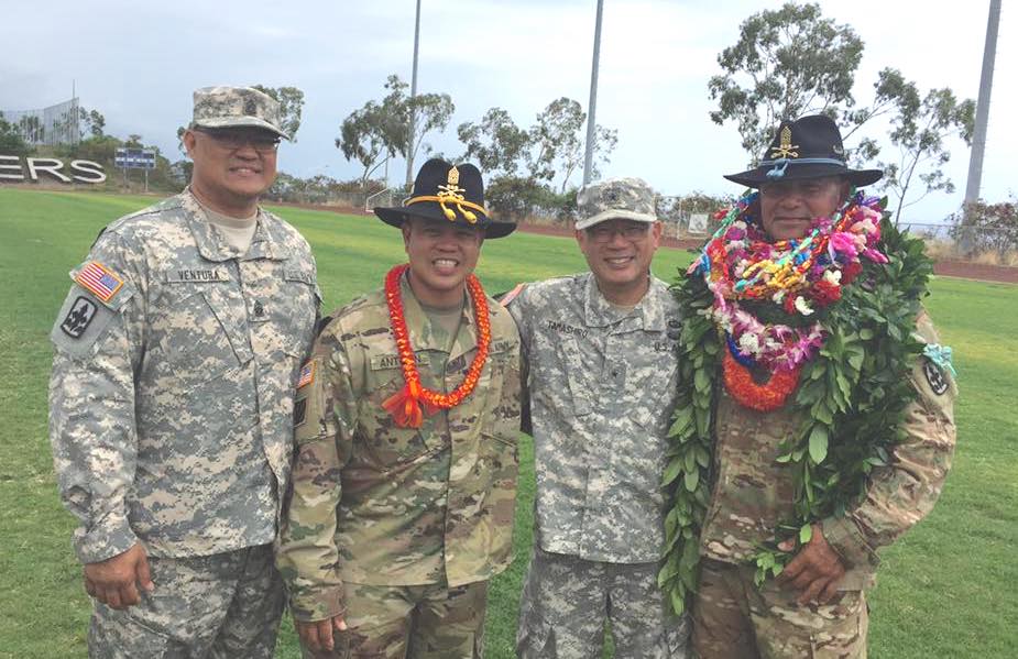 In the photograph, CSM Leonard Ventura, CSM Shon Antolin, BG Keith Tamashiro and CSM Craig Ynigues take moment together after the Change of Responsibility ceremony.
