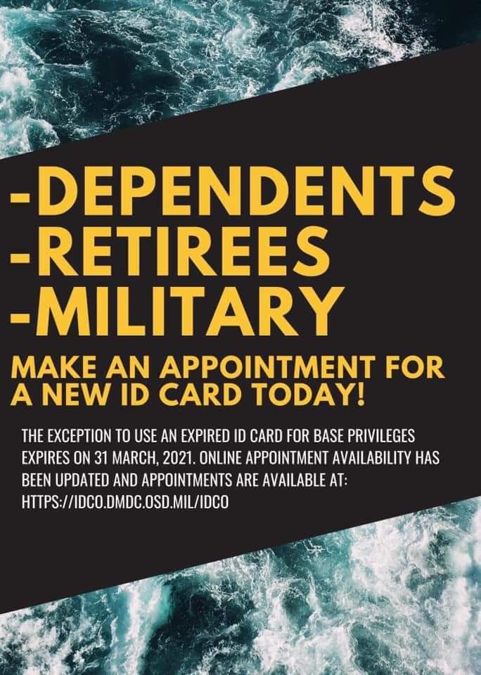 Since the publication of this information, the Department of Defense extended the deadline until June 30, 2021. If you go to this link – https://idco.dmdc.osd.mil/idco/ – you can schedule an appointment. Many will wait until June and that means fewer appointment times available as the deadline approaches.