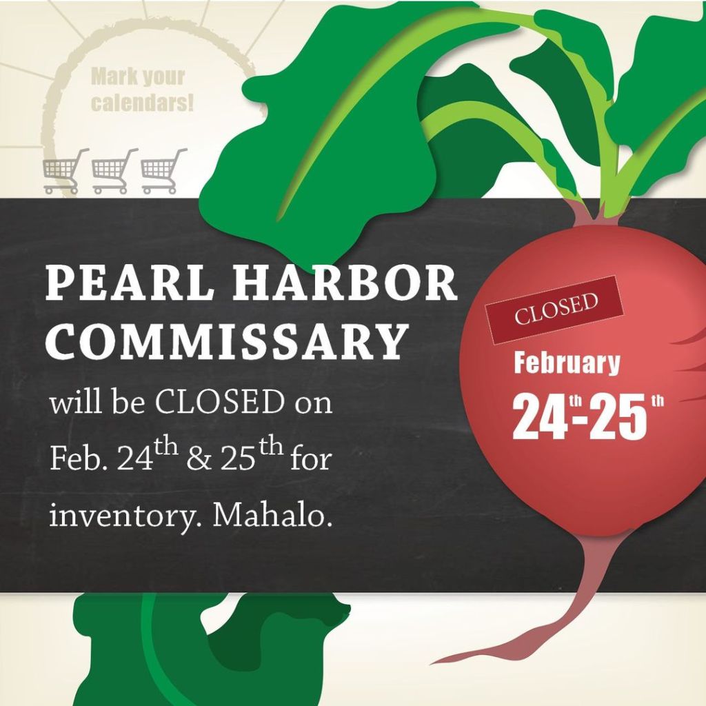 Hickam Commissary will be closed on February 24th & 25th due to inventory. The commissary will reopen on Thursday, February 26th, with normal business hours, from 0900-2000.