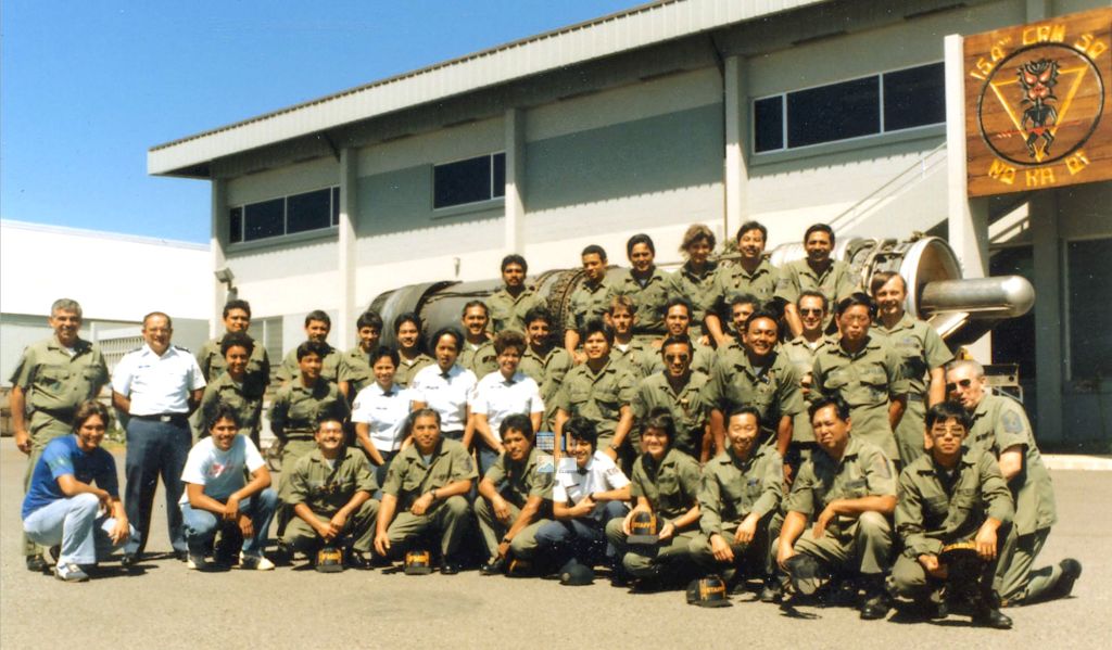 Believe the photograph was taken in the early 1980s. It is a J79 engine used in F-4 Phantoms in the background. The then-154th Composite Group converted to F-15 Eagles in 1985. Additionally, William “Bill” Austin, the Engine Shop chief, retired in 1983 or 84.