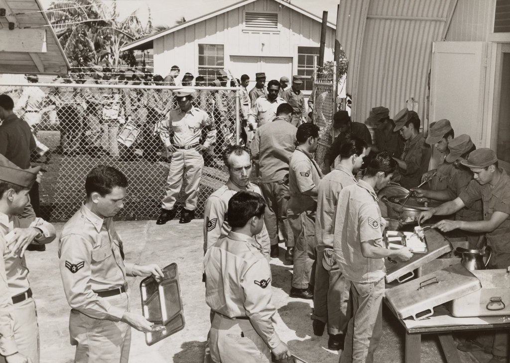 This undated photograph shows Airmen in the chow line. The 199th Fighter Squadron facilities were located in Area 65 on Hickam Air Force Base. Love those metal trays.