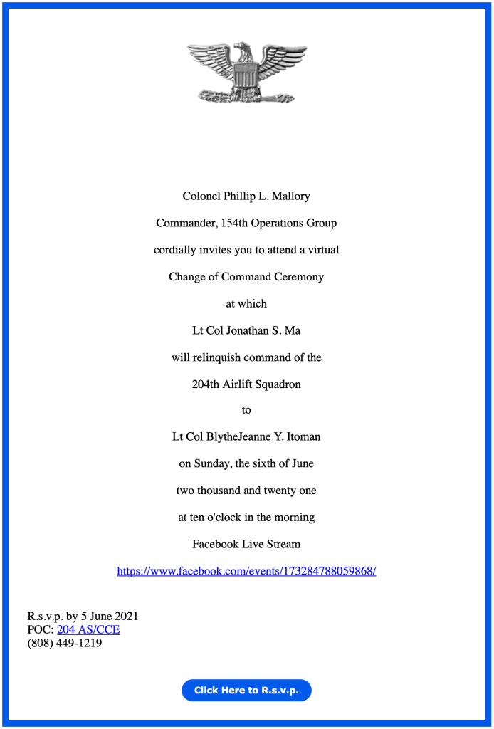 154th Wing (154 WG), 204th Airlift Squadron (204 AS), BlytheJeanne "BeeJ" Itoman, Change of Command (CoC), Jonathan S. Ma, Phillip Mallory, virtual ceremony