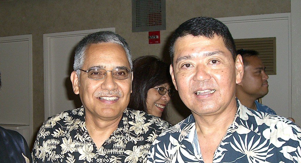 Second from the left is Greg Navarro, a chief master sergeant who retired from the 291st Combat Communications Squadron, Hawai‘i Air National Guard, in Hilo. First on the right is Wayne Yoshioka, a lieutenant colonel who retired from the Hawai‘i Army National Guard. Wayne served in several positions including the State Department of Defense’s public affairs officer.