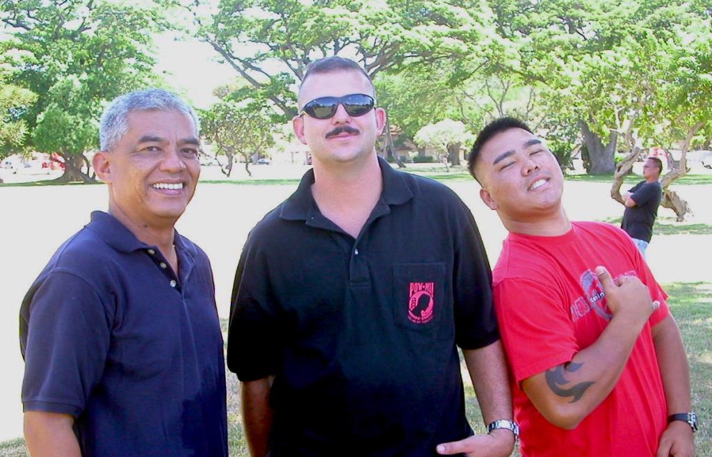This photograph shows Ray Duropan, Michael Armisted, and Shon Kele, all members of the 154th Security Forces Squadron. It was taken on June 6, 2004.