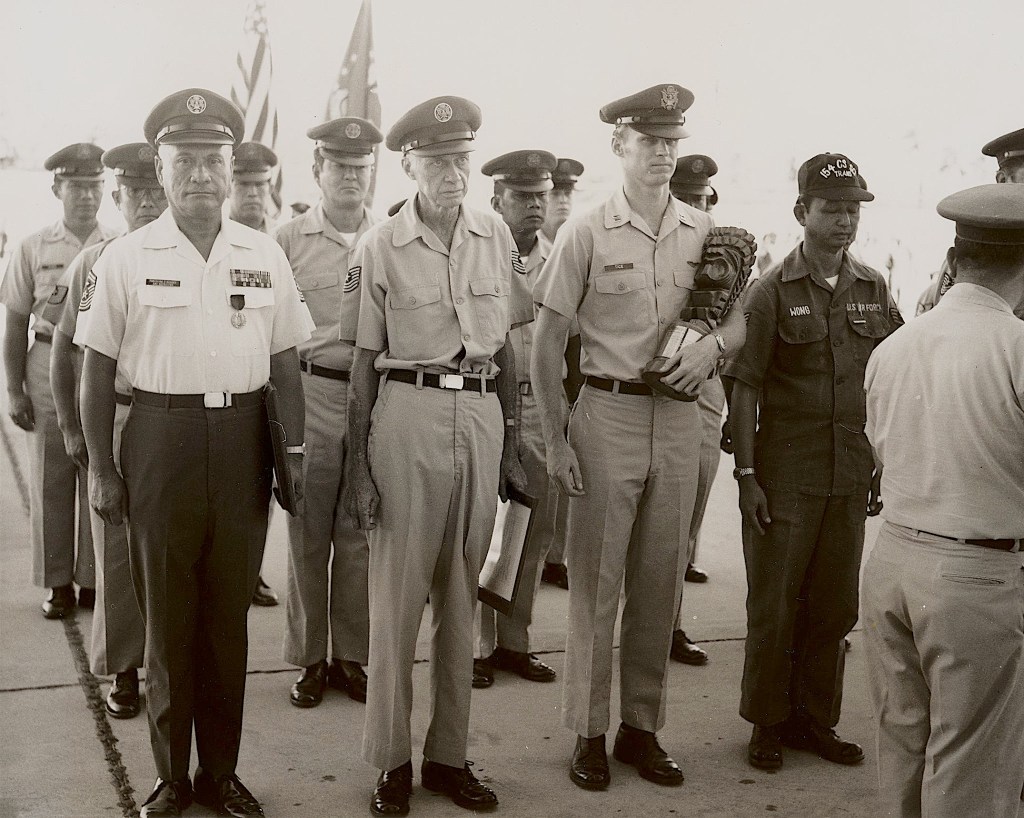 CMSgt Hussey retire later in the month after 34 years of service. He enlisted in the Hawaii Army National Guard in 1939. He transferred to the Hawaii Air National Guard in the late 1960s.