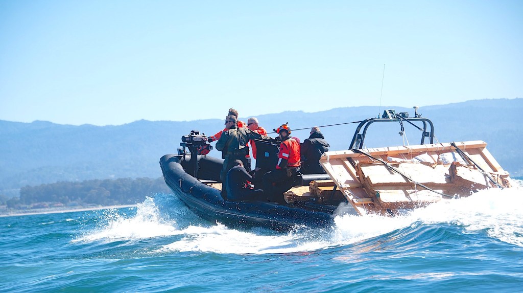 Guardian Angel pararescuemen from the 131st Rescue Squadron, California Air National Guard, conduct a search and rescue training scenario May 20, 2021, at Santa Cruz Water Drop Zone, California. The Airmen, rescue craft and life-support equipment were airdropped by a C-17 Globemaster III, operated by a Hawai‘i Air National Guard aircrew. Members validated their ability to recover a splashed-downed team of astronauts during a contingency rescue event.
