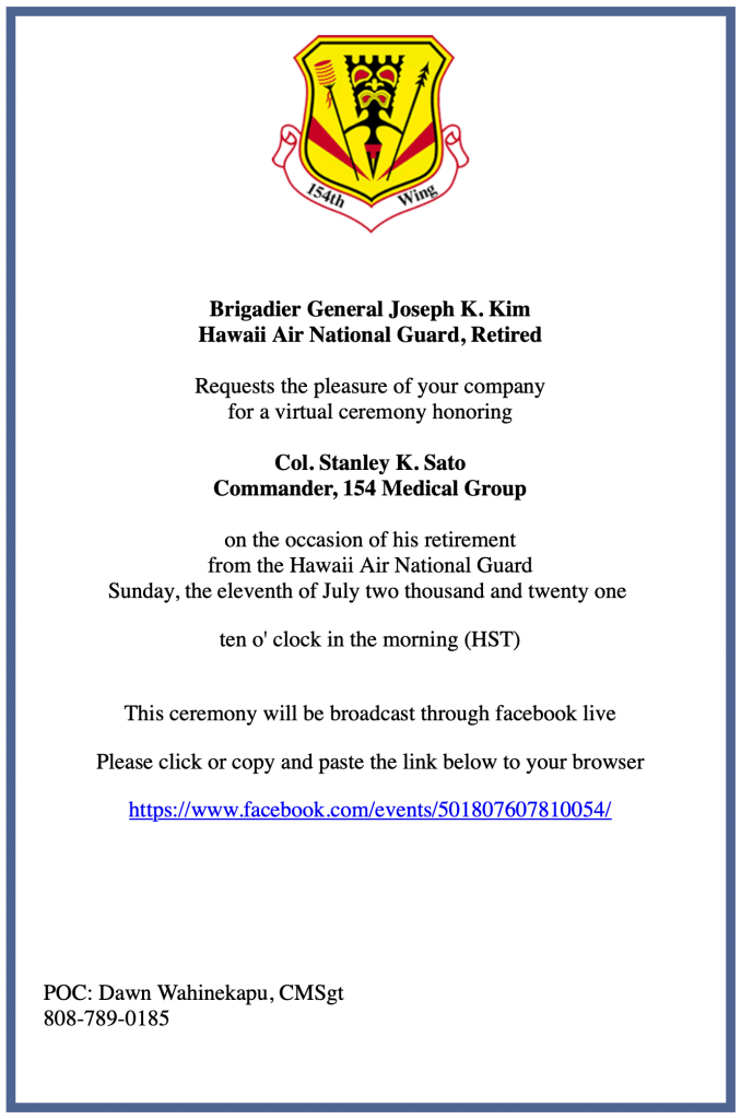 154th Medical Group (154 MDG), 154th Wing (154 WG), Facebook, Joseph K. Kim, retirement ceremony, Stanley K. Sato, virtual ceremony