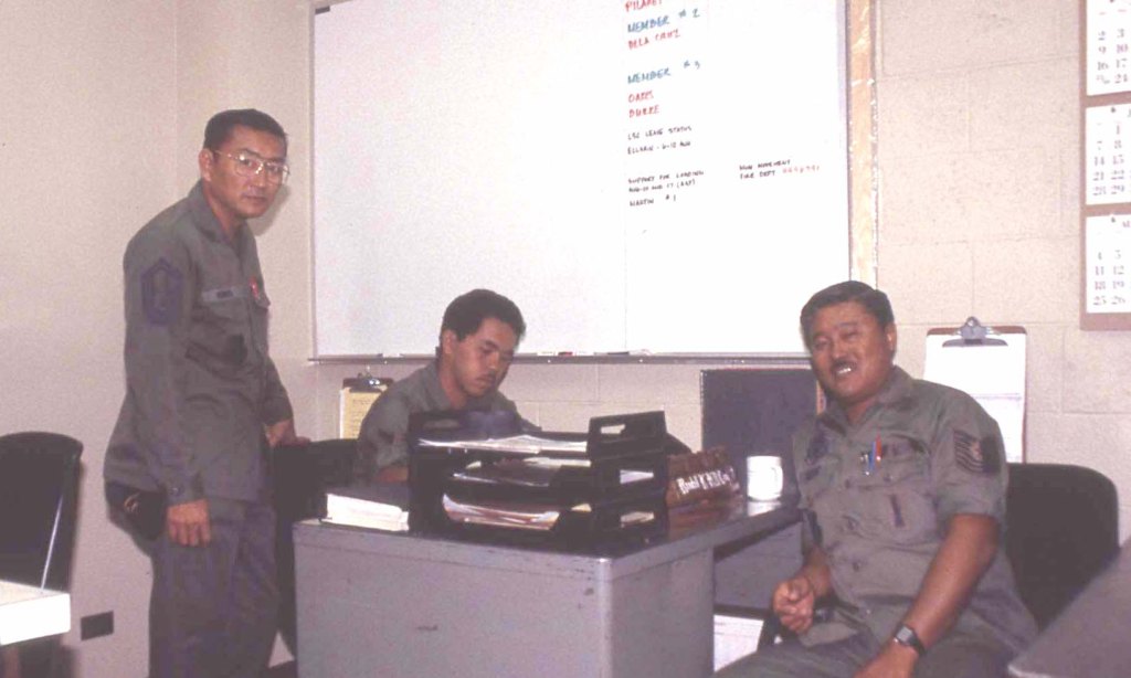 This photographs shows Kenneth Iinuma, Dewey Dela Cruz and Thomas Hirao. The 154th Composite Group was flying F-4C Phantoms and munitions were an important part of the aircraft weapons system.