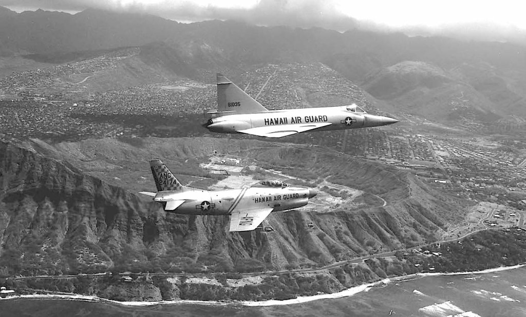 During aircraft conversions, there are many two-ship aircraft photographs shown the current and future aircraft. This photographs shows a F-86L Sabre Interceptor and a F-102A Delta Dagger flying off Diamond Head.