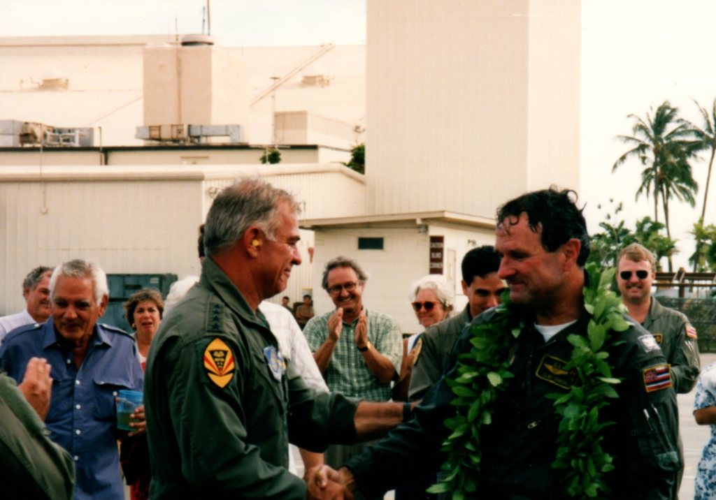 Col Clinton “Church” Churchill flew his fini flight in September 1995. During his HIANG career, he flew Convair F-102A Delta Daggers, McDonald Douglas F-4C Phantoms, and McDonald Douglas F-15 Eagles.