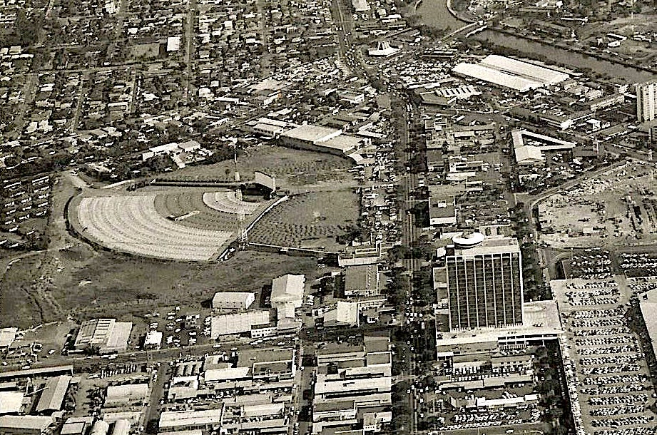 Photograph 3: This photograph was probably taken between 1960 and 1962. It shows the Kapi‘olani drive-in theater in relationship to the Ala Moana Shopping Center, which was constructed in 1960.