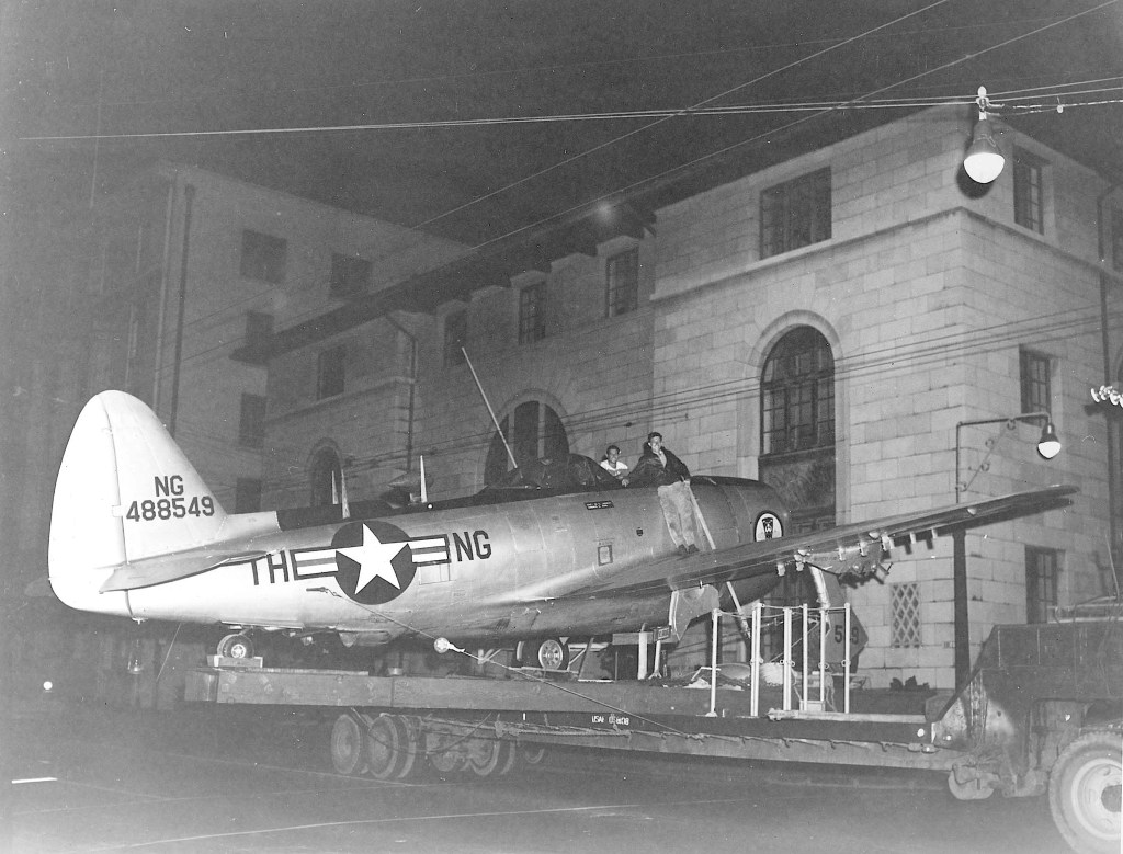 In May 1950, a 199th Fighter Squadron F-47N Thunderbolt was hauled, fully assembled, on a flatbed trailer in the wee hours of the morning from Hickam AFB to be set up as a static display at Kapi‘olani drive-in theater lot on Kapi‘olani Boulevard in Honolulu. The static display was part of the public relations to go along with the premiere showing of the movie “12 O’Clock High”.