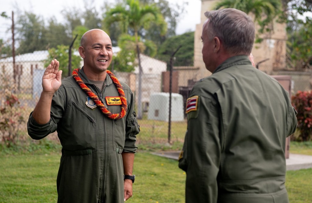 Friends, leaders and ‘ohana attended to witness this intimate promotion ceremony outside of the 154th Operations Group.