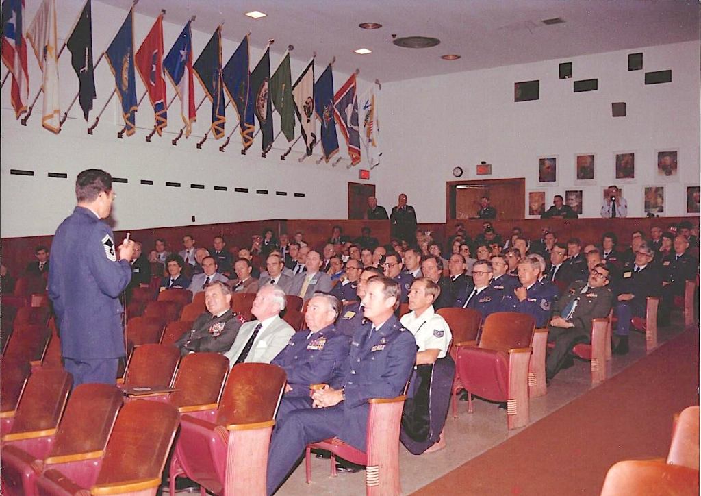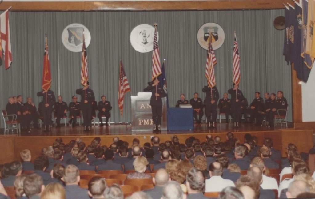 At the time, Patriot Hall was the only large auditorium on the campus. The sides of the auditorium had the flags of all 54 states and territories. The first day of the Leadership School, the NCO Academy and the Academy of Military Science had students sitting at attention waiting for the instructors to arrive.