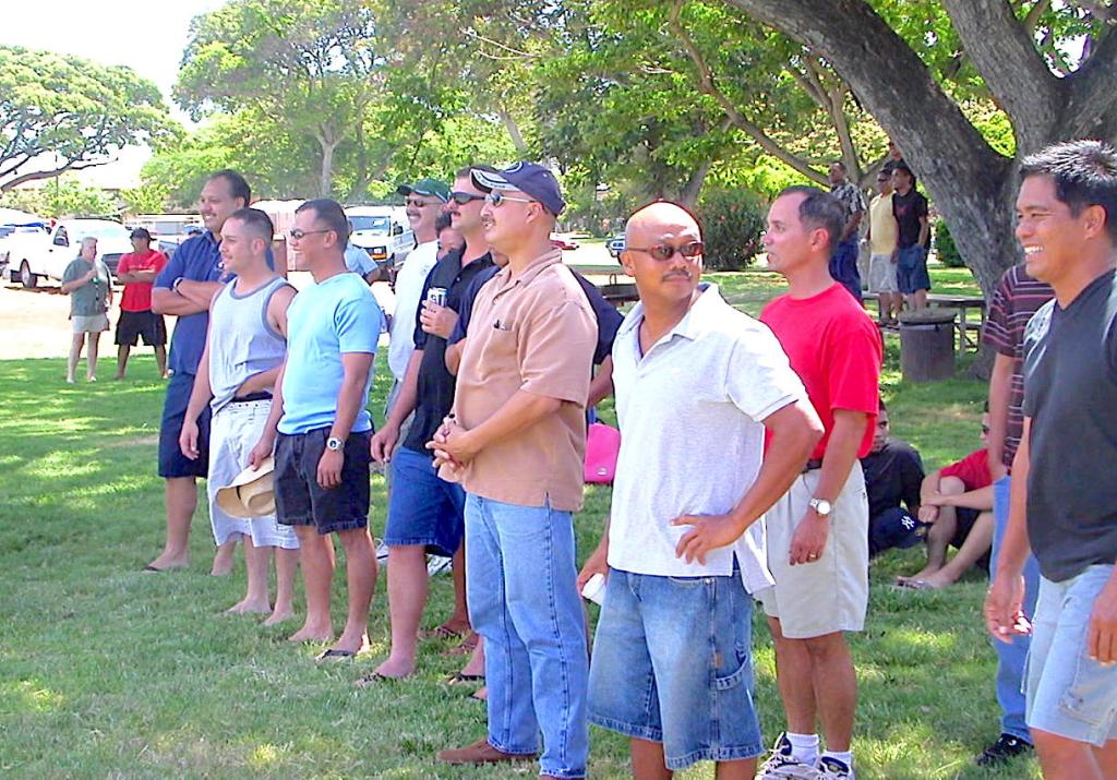 This photograph shows members to the 154th Support Group during a party during the June 2004 UTA weekend. They were watching some of the unit games during the party.