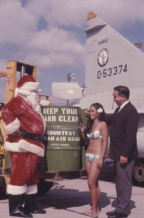 Lt Col Harold T. (“Slim”) Mattos donned a Santa Claus suit December 29, 1969 when he presented 202 steel drums, painted for trash cans, to the Honolulu City & County Department of Parks and Recreation. These steel drums had been cleaned and painted by the CAMRON NCOs for their community’s use. Have fun! Keep it clean!