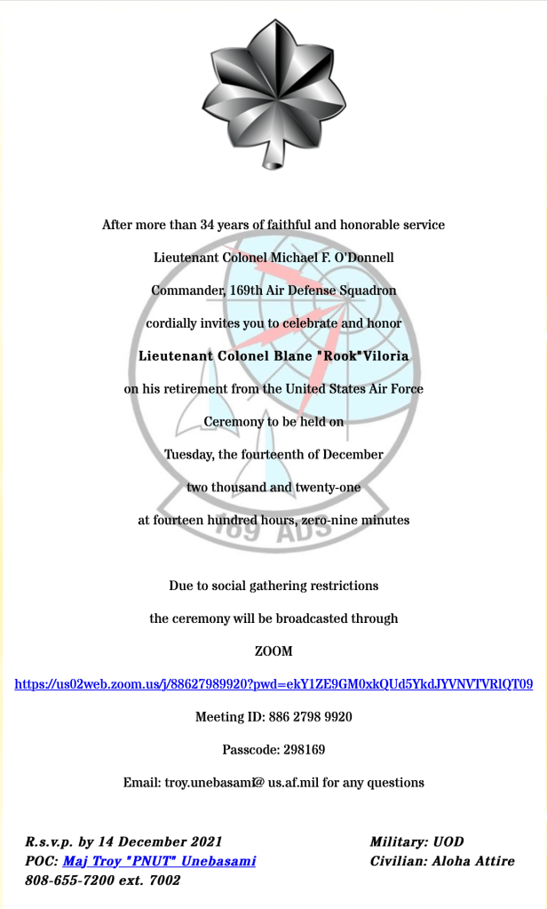 169th Air Defense Squadron (169 ADS), Blane H. Viloria, retirement ceremony, Troy Unebasami, virtual ceremony, Zoom