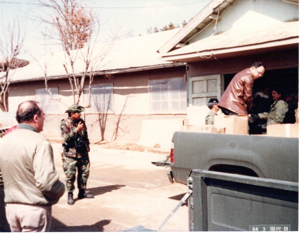 The 201st Combat Communications Group deployed to Team Spirit exercise in Korea from the late 1970s through the early 1990s. These photograph show 291st Combat Communications Squadron members unloading clothing and other supplies at the orphanage located near Osan Air Base, Korea.