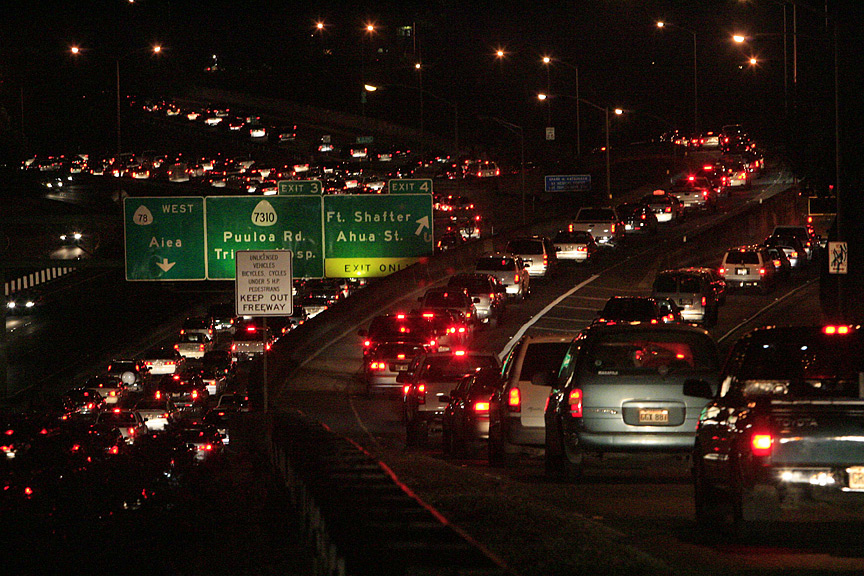 Motorists were still snarled in heavy traffic late last night on the H-1 freeway near Middle Street in Kalihi. Jamm Aquino photograph from the linked Honolulu Star Bulletin article