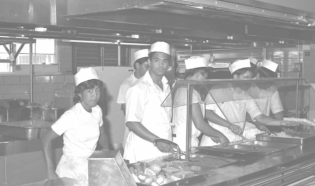 This undated photograph shows the food line in the 154th Composite Group’s old chow hall. Services were provided by members of the then-154th Combat Support Squadron. However, most of the workers were contract workers. In this photograph, there is only one person wearing a military collar rank (airman, second from the right).