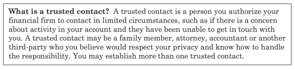 For the past few years, financial services companies have been bugging me to name a “trusted contact.” Banks, brokerages and insurers increasingly want to have someone to call or email in case they notice suspicious activity and can’t reach the account holder.