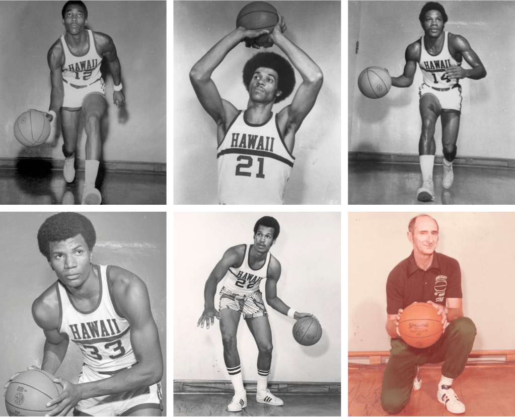 Al Davis. Jerome Freeman. Dwight Holiday. Bob Nash. John Penebacker. These five young men came to the Islands and, along with their teammates and their head coach, Red Rocha, put Rainbow Warrior basketball on the college basketball map. Their accomplishments included a number of notable firsts: the program’s first postseason appearance, its first win over a ranked opponent, its first Rainbow Classic championship and its first national ranking.