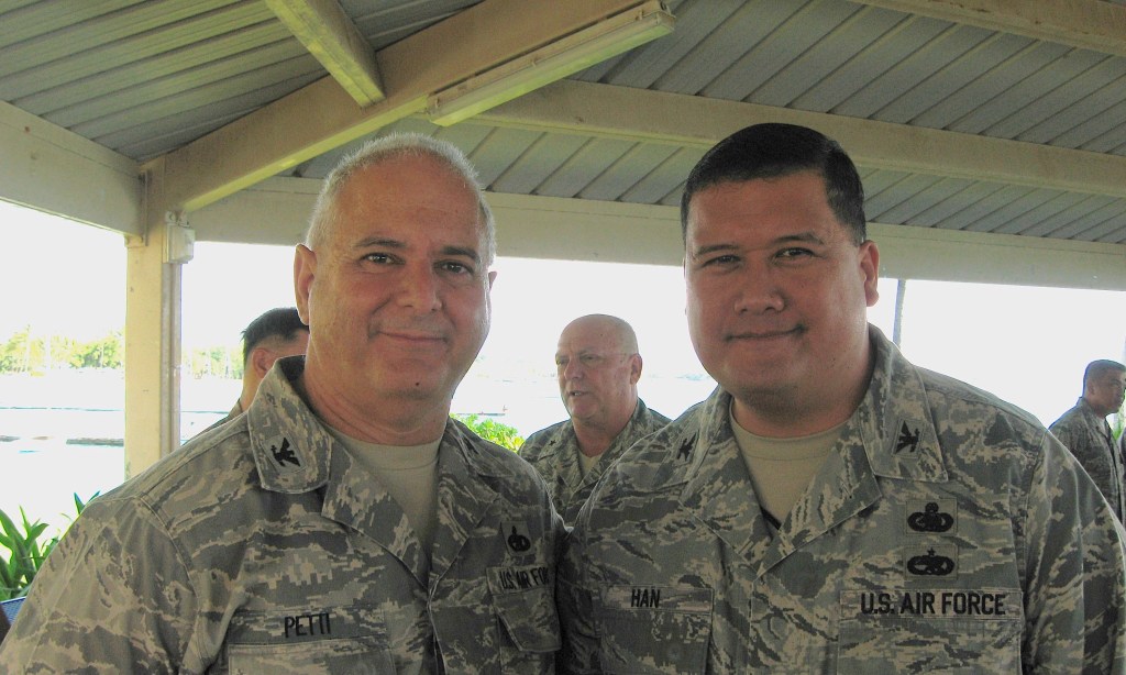 This photograph show William Petti and Ronald Han, with Stanley Osserman in the background. They were attending the chief master sergeant promotion ceremony of Ray Duropan. The ceremony took place on December 2, 2009.