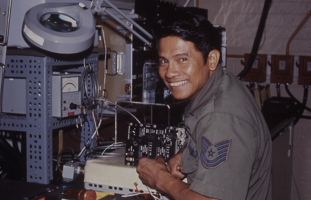 This undated photograph shows Lionel Calvin at his workbench in the Avionics Branch. Lionel served his career in the 154th Consolidated Aircraft Maintenance Squadron. A great technician.