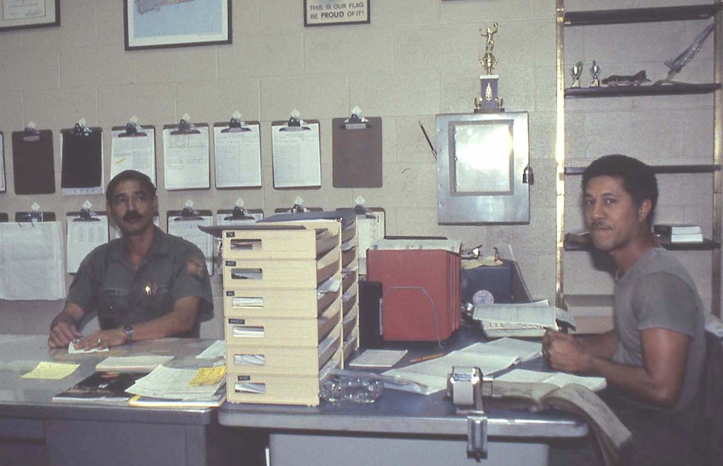 This undated photograph shows David Leong and William Beck from the F-4 Engine Shop. Both served many years in the Hawaii Air National Guard before their retirements.