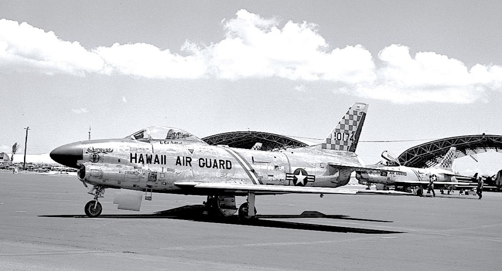 This undated photograph shows a North American F-86 Sabre that the 199th Fighter Squadron flew from 1954 through 1958. The photograph was taken in Area 65, the first Hawaii Air National Guard operating location on Hickam Air Force Base. The name on the canopy is “Lt Col (James) Ashford” and was nicknames the “Shiny Thing”, The crew chief was Kenneth “Kenny” Camara, who buffed and polished the aircraft with a lot of hard work and pride.