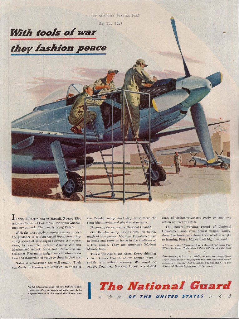 This advertisement appeared in The Saturday Evening Post on May 24, 1947. The Army Air Corps were recruiting men to enlist in what was to become the Air National Guard. Many individual States – like the Hawaii – had units that were already Federally recognized.