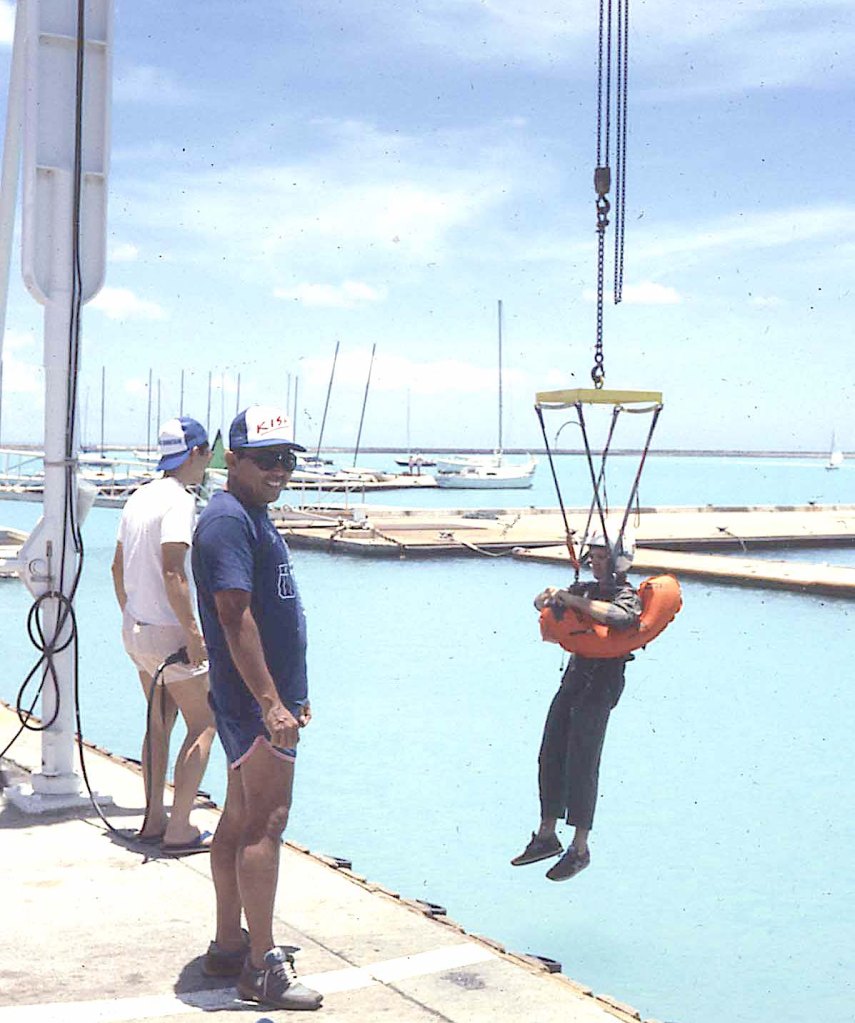 This undated photograph shows Fred Takara and another member of the Parachute Shop conducting water entry training with an unidentified aircrew member. This was part of the ground training all aircrew members received. Not really the way you would want to spend time in the water.