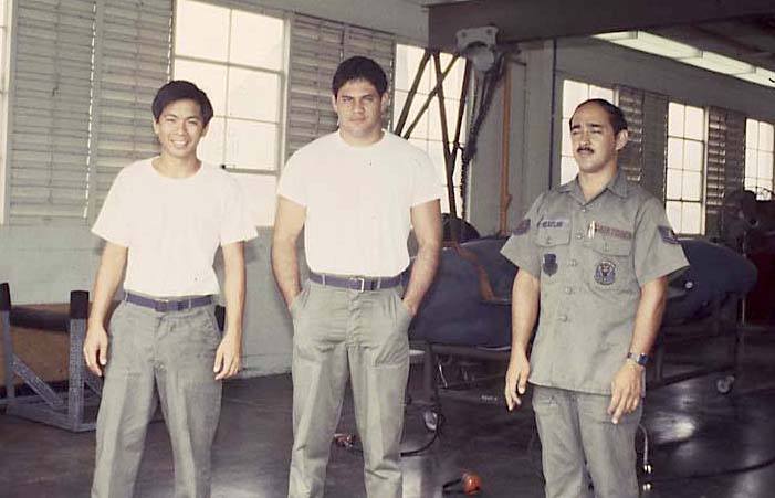 This undated photograph shows three members of the Fuel Systems Shop in the 154th Consolidated Aircraft Maintenance Squadron. In the photograph are (L-R) Darryl Loo, Gary Doane, and Ronnie Miraflor.
