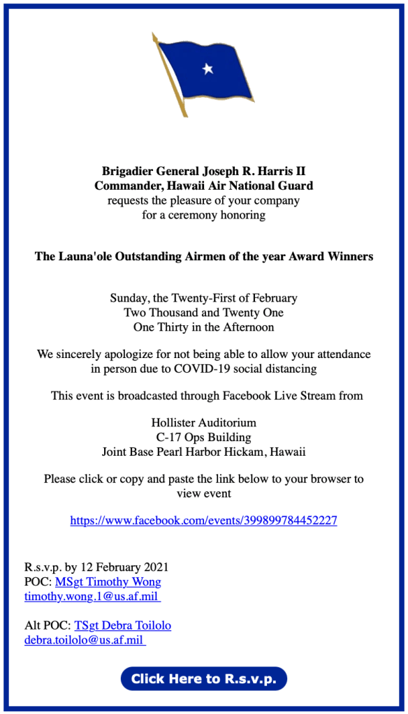 The Kūkā‘ilimoku is the official e-newsletter of the 154th Wing, Hawaii Air National Guard. This edition includes reflections from Hawaii Air National Guard leadership, 154th Logistics Readiness Squadron’s contributions to Operation Angel Tree, a TFI pilot extraction exercise and various airlift missions, entailing the delivery of COVID-19 vaccines to neighboring Hawaiian islands.